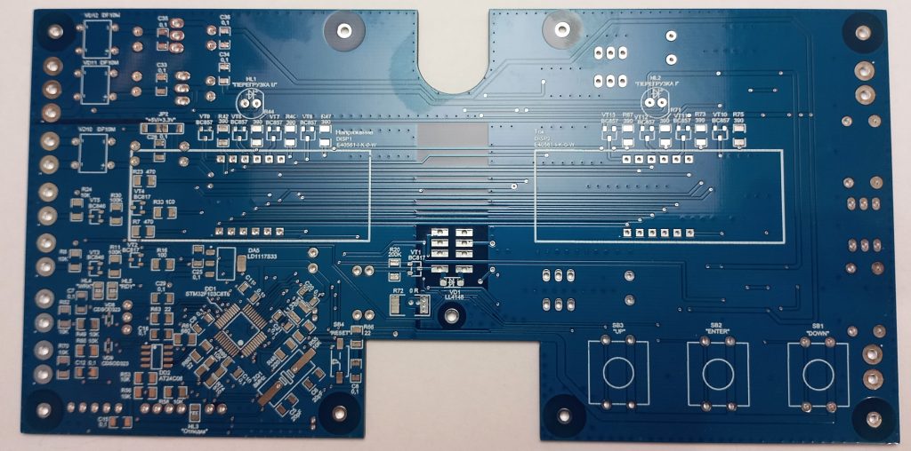 Печатная плата имеет внушительные размеры. Дело в том, что это сделано намеренно потому, что размеры определялись исходя из того, что она должна быть монтируема непосредственно на лицевую панель уже готового существующего прибора. То есть размеры были заданы изначально. Впрочем, такие большие размеры упростили процесс разводки печатной платы, что лично для меня явилось только плюсом и облегчающим фактором. Разумеется, что для других каких-либо целей плата, скорее всего, претерпела бы оптимизацию по размерам. С другой стороны, для других задач наверняка из схемы устройства ушло бы приличное количество элементов и разъёмов, необходимых именно в этом проекте.